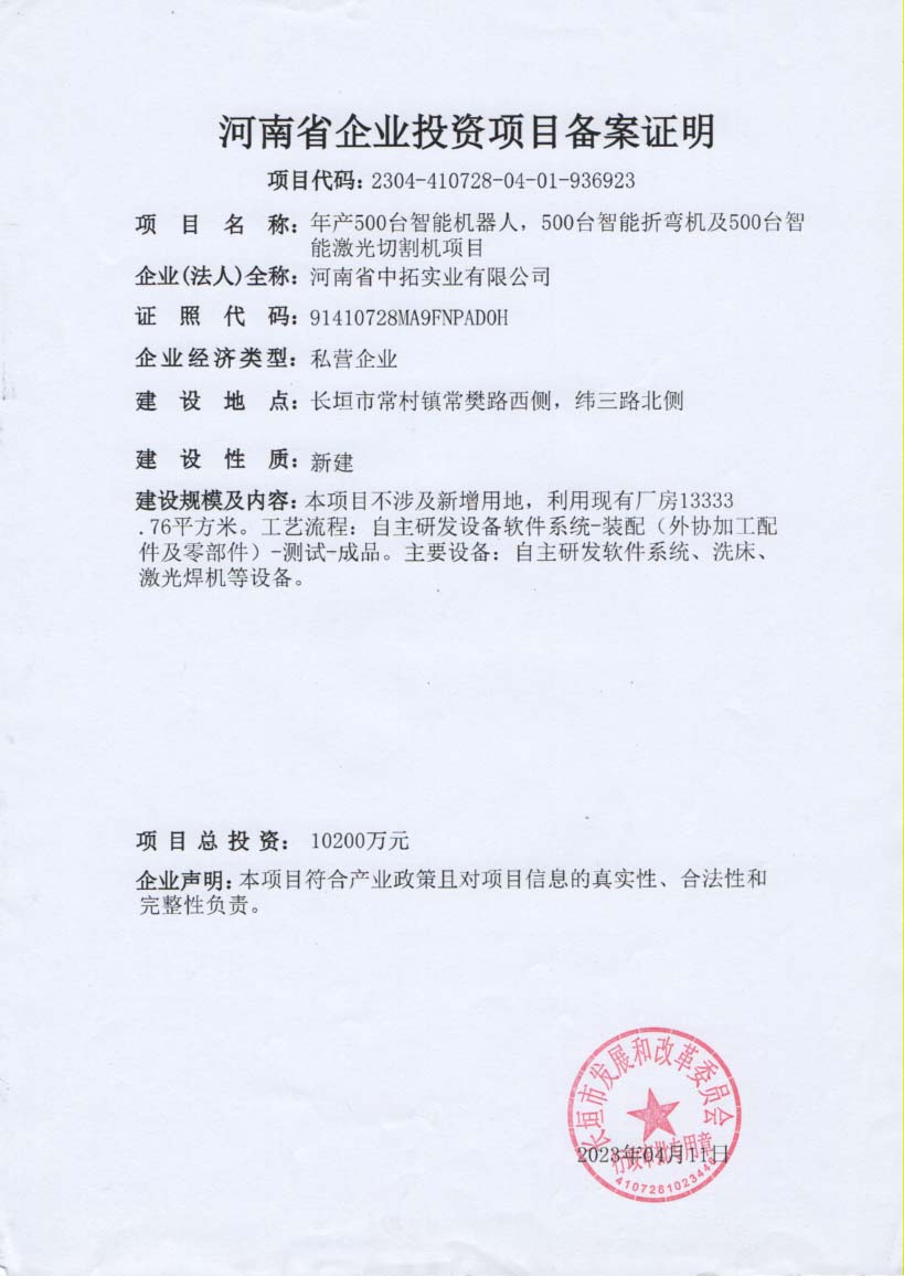 大圣智能折彎?rùn)C(jī),機(jī)械臂,激光切割機(jī)工廠備案證明